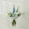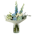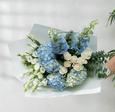 Azraq bouquet includes blue hydrangeas, blue delphinium combined with white rose and lisianthus. This is the bestseller gift for baby boy. Vase not included.