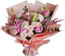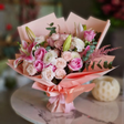 Bambi Bouqet is made of oriental pink lilies, roseta vandella rose, pink bombastic, astilbe red and cenerea leaves. ***We fully depend on the Floral Farms all around the World. If any flower is not available in the order, we will replace it with identically colored flowers, to keep same style and color combination.