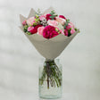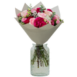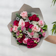 Farida Bouquet is made of Rose Secret Garden, Eustoma, Spray rose hot pink lace, Brunia grey, Ozothamnus white and Eucalyptus leaves. Vase not included.