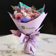 Lilac Bouquet is made of pink tulips, syringa purple,single chrysanthemum narrow, eryngium blue and ranunculus peach. ***We fully depend on the Floral Farms all around the World. If any flower is not available in the order, we will replace it with identically colored flowers, to keep same style and color combination. Matched with the arabian glow mini marble Lava Candle.